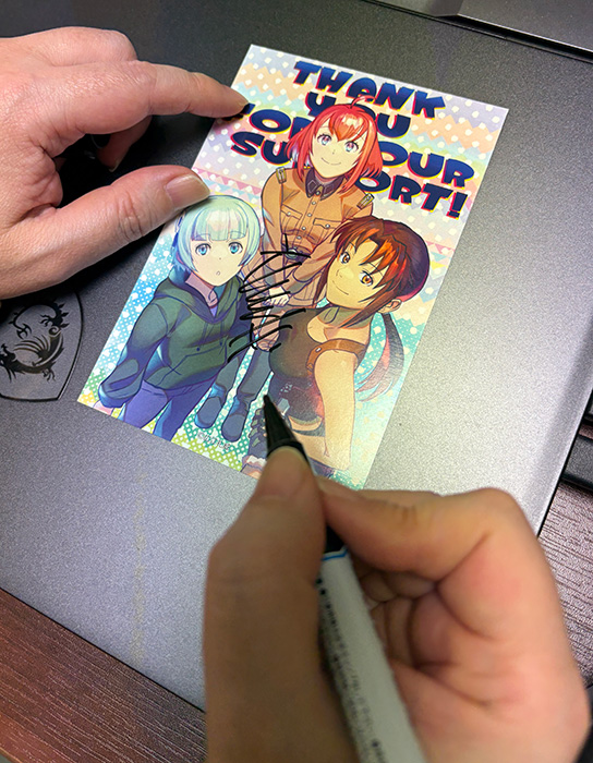 「いつも『BLACK LAGOON』を応援していただきありがとうございます。画像はせんせーがファンレターを送ってくれた方に返礼として送るポストカードにサインを入れているところです。」